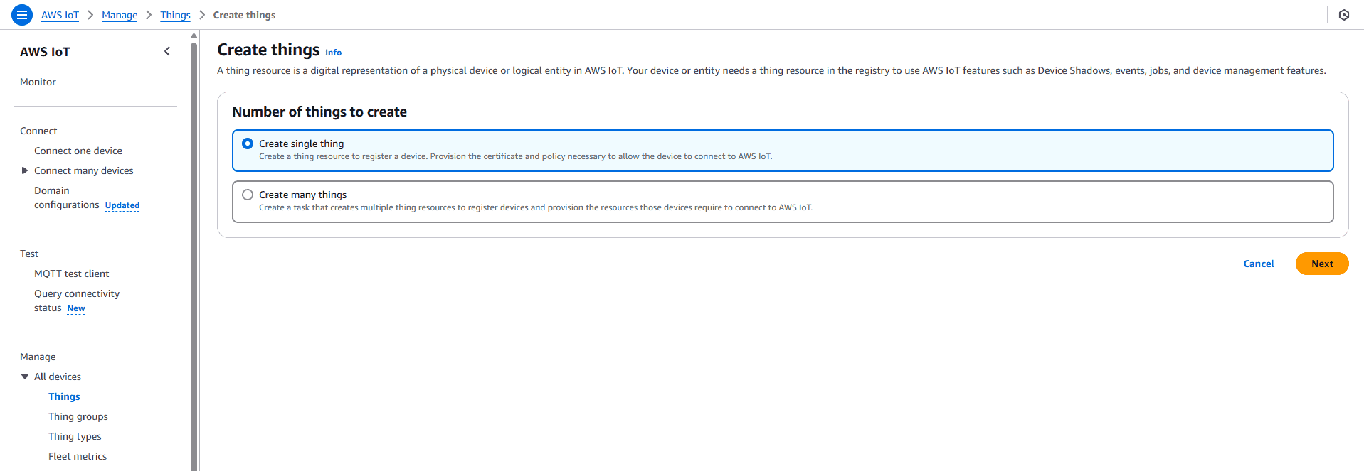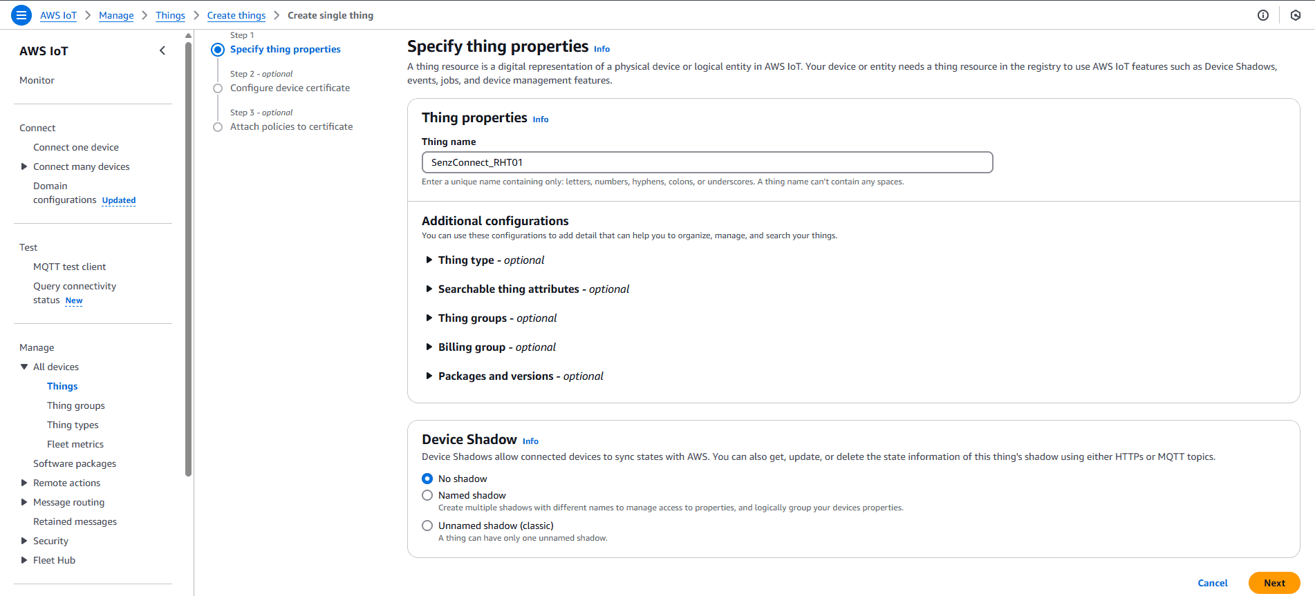 - Select “Create single thing” and enter the “Thing name”.