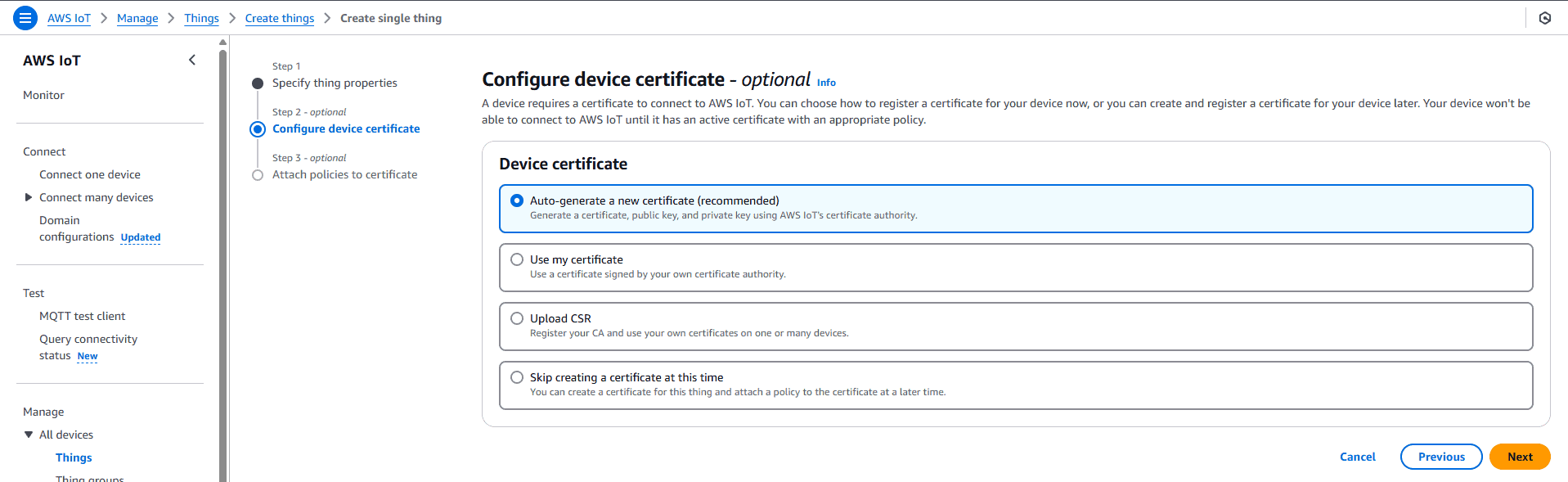 - Choose “Auto-generate a new certificate” under “Device certificate”.