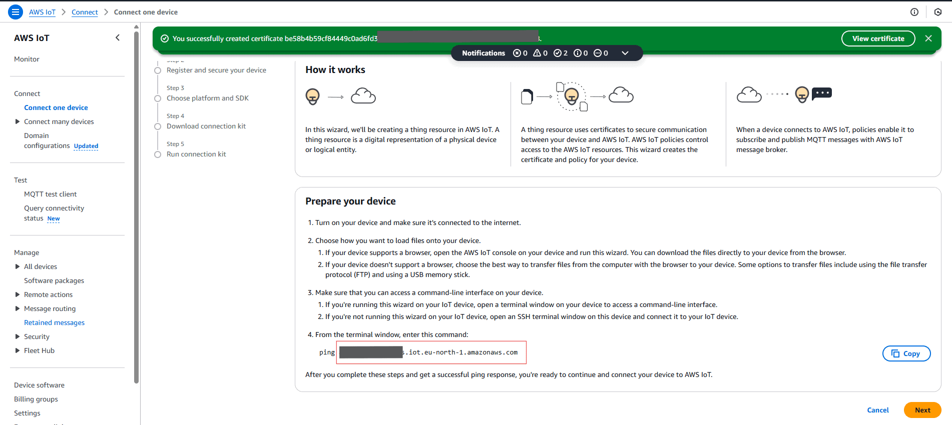 - Attach your respective policy to the certificate and “create thing”.