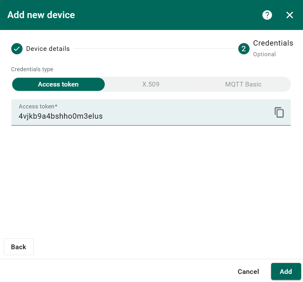 - Access Token (default): Copy the token generated, you’ll use it as the MQTT username later.