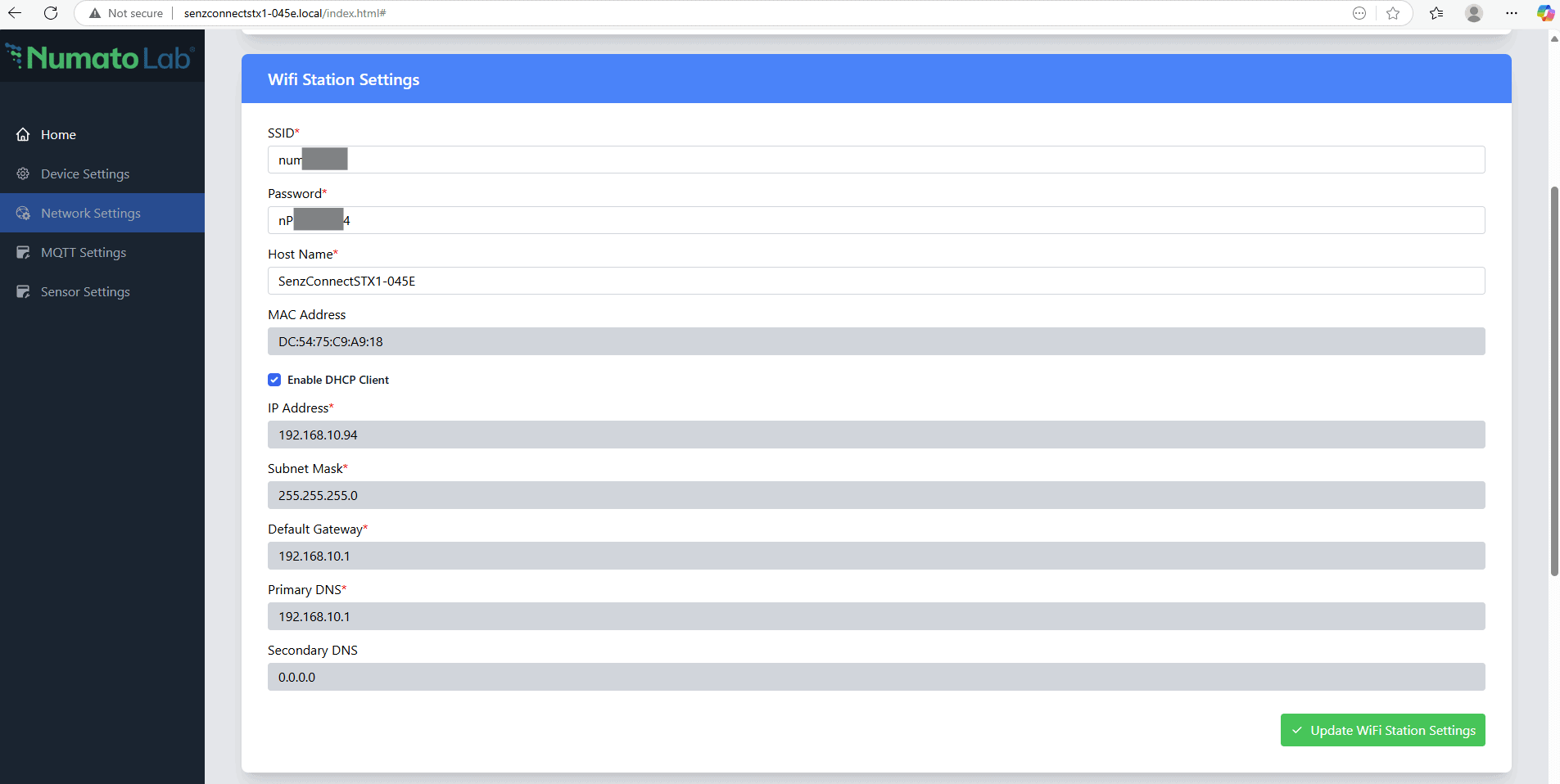 The SenzConnect device allows you to configure the device’s connection to an existing Wi-Fi network. You can update the SSID, set the password, adjust the hostname, and configure the network settings according to your needs.