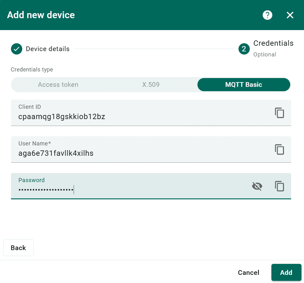 - MQTT Basic: Enter your own or auto-generated client ID, username, and password, both are used during device configuration.