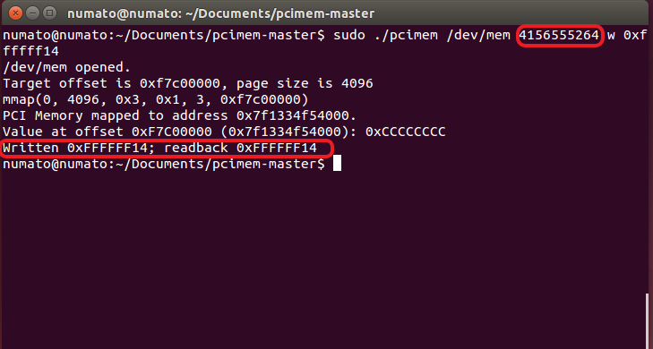 sudo ./pcimem /dev/mem 4156555264 w 0xffffff14