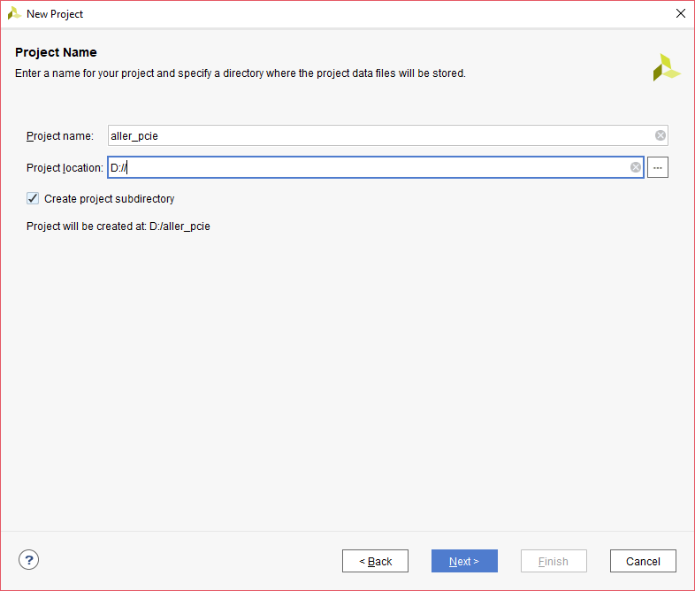 Open Xilinx Vivado Design Suite. Go to File -> Project -> New. The “New Project” wizard will open. Click “Next”.