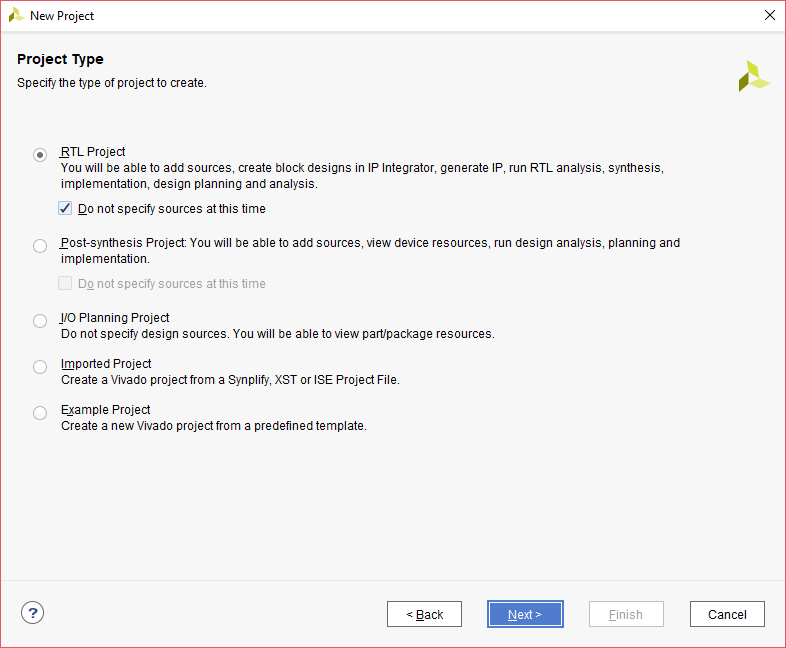 In the “Project Type” window, select “RTL Project” and select the option “Do not specify sources at this time”. Click “Next”.