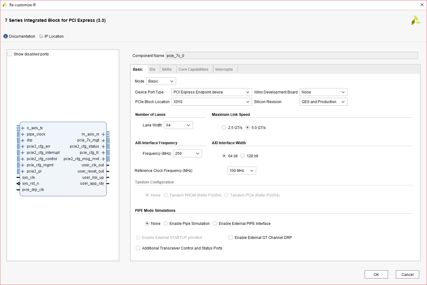 Double click on pcie_7x_0 IP, this will opens the “Re-customize IP” window. In the Basic tab, Select “Lane Width” as “X4”, “Maximum Link Speed” as “5.0 GT/s”. Leave the other tabs in their default state and click “OK”.