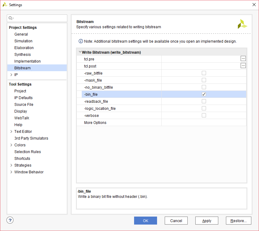In “Bitstream Settings”, select “-bin_file” and click “OK”.