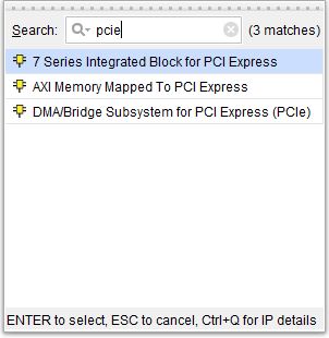 Click “Add IP” from the toolbar as shown in the image below. Type “pcie” in the search box and double click on “7 Series Integrated Block for PCI Express” IP to add it to the design.