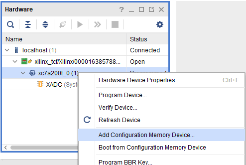 If the device is detected successfully, then select “Add Configuration Memory Device” by right click on the target device “xc7a200t_0” as shown below.