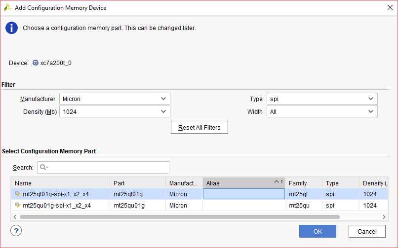 Select the memory device “m25ql01g-spi-x1_x2_x4”, then click OK.