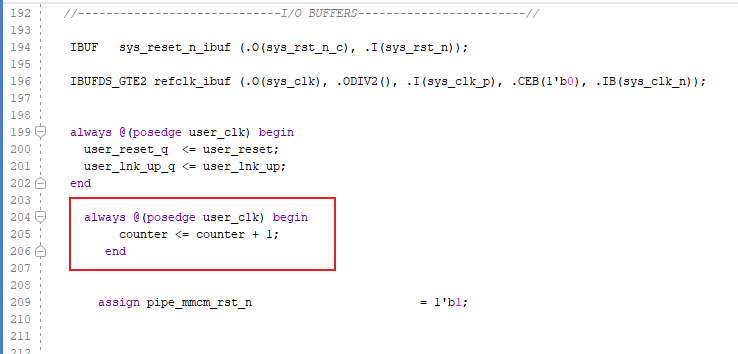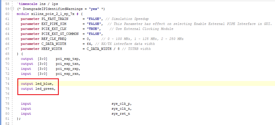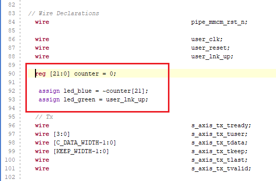 In the pcie_7x_0 IP example design, there is a user_lnk_up logic to indicate that the PCIe link between the host PC and the FPGA is ready to exchange the data when we connect the FPGA board to the PCIe slot of the motherboard. HSFPX002 board features a Bi-Color LED. Hence, connect the user_lnk_up logic output to the Green LED. The Green LED will glow when the PCIe link is ready to exchange the data. So by connecting the user_lnk_up to this LED, we can observe that the PCIe link between the host the PC and the FPGA is ready to exchange the data or not. Also, add the counter to check whether the PCIe clock is working or not, and assign the counter output to the Blue LED. So that we can observe the Bi-Color LED blinking when the board is detected by the host PC.