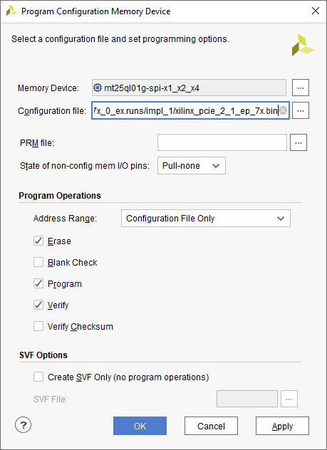 A dialogue window will appear asking if you want to program the configuration device now. Click OK and program the “.bin” bitstream file which is located in “<project location>/ProjectName.runs/impl_1” directory.