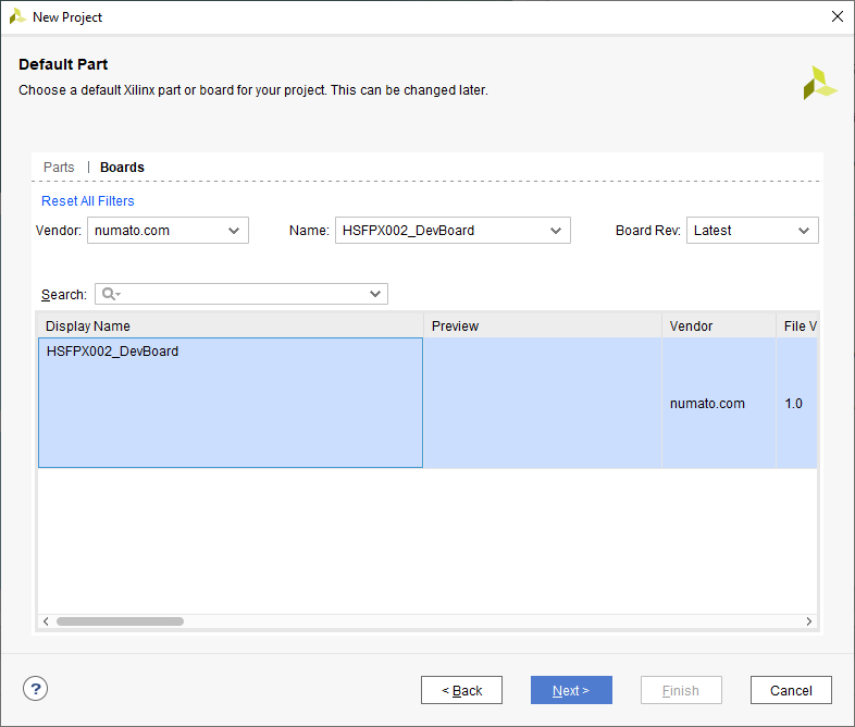 Select “Boards” from the “Default Part” tab, choose “numato.com” as Vendor. Select “HSFPX002_DevBoard” and click “Next”. If HSFPX002 is not listed, make sure the board support files are installed correctly. Click “Finish”. A new Vivado project will open with the selected settings.