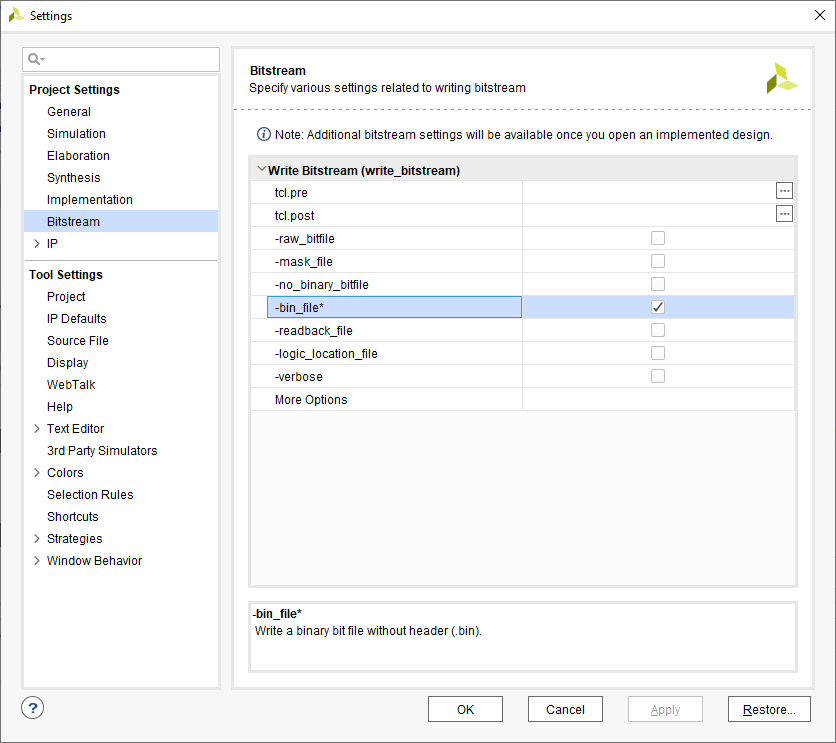 In the “Bitstream Settings” window, select “-bin_file” and click OK.