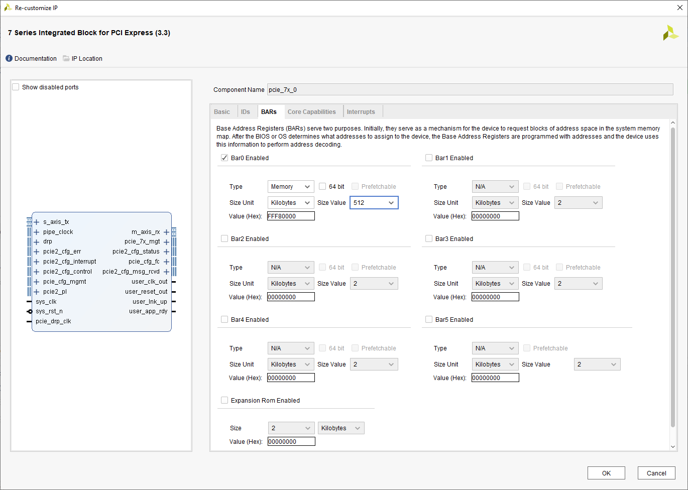 To make the IP compatible with the PCIe specifications of the HSFPX002 board, double click on the “7 Series Integrated Block for PCI Express” IP to customize it. The “Re-customize IP” window should open. In the Basic tab, Select “Lane Width” as “X4”, “Maximum Link Speed” as “5.0 GT/s”. In the “BARs” Tab, select Size Value as “512”. Leave the other tabs in their default state and click OK.