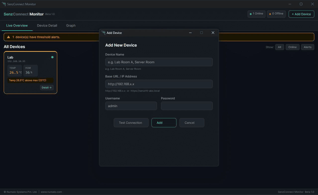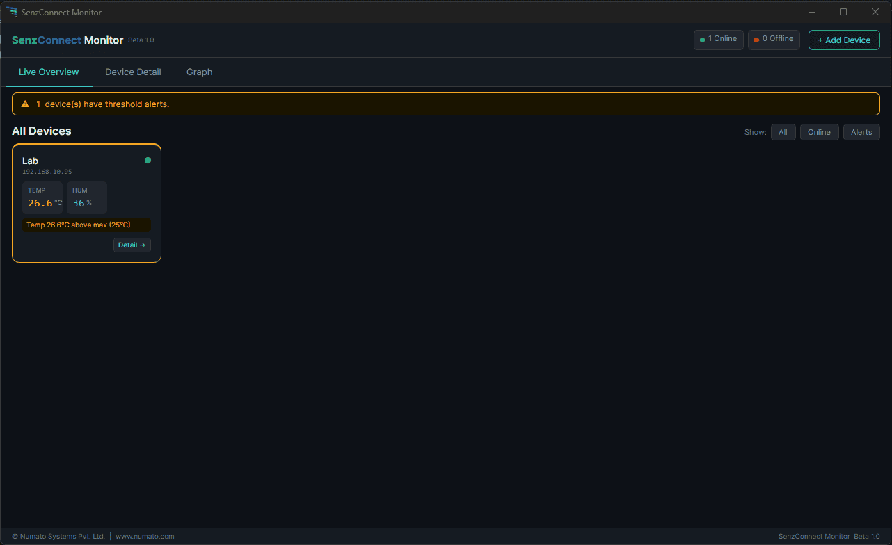 Numato Lab’s SenzConnect Monitor windows application provides a centralised dashboard to monitor all your SenzConnect devices in one place.