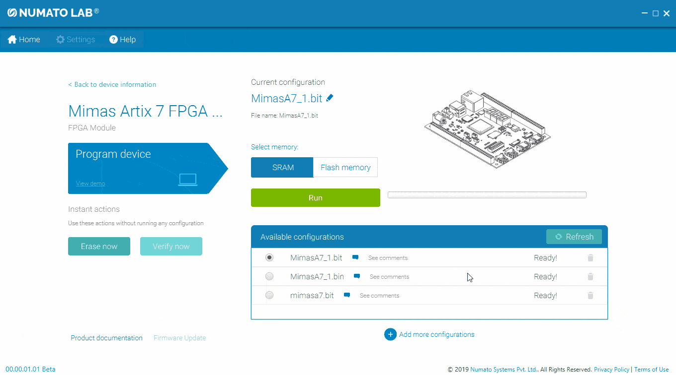 If you are testing the board and have programmed the board with different configuration files and now are confused as to which configuration file was last programmed to the FPGA, not to worry. You can now easily check the last file programmed in just few steps. In the Program Device page, under Available configurations, select a configuration and then click on “Verify Now” button (NOTE: before verifying, make sure that the board is booted from the SPI Flash else the verification will fail). This will verify if that particular file is present on the FPGA or not. The below video demonstrates the above mentioned steps.