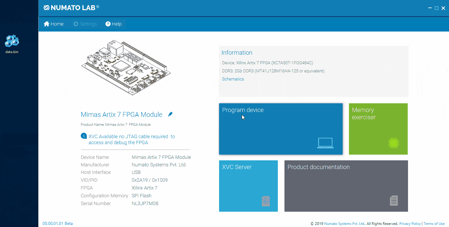 The board has to be programmed with a bitstream for the Memory Exerciser feature to work. This bitstream can be found in the application’s installaion directory where the application is installed. If the path where the application is installed is C:/Program Files (x86)/Numato Lab, the the bitstream can be found in the path “C:\Program Files (x86)\Numato Lab\Tenagra\app\data\config\bitstreams”. Use the bitstream of the board you are using.