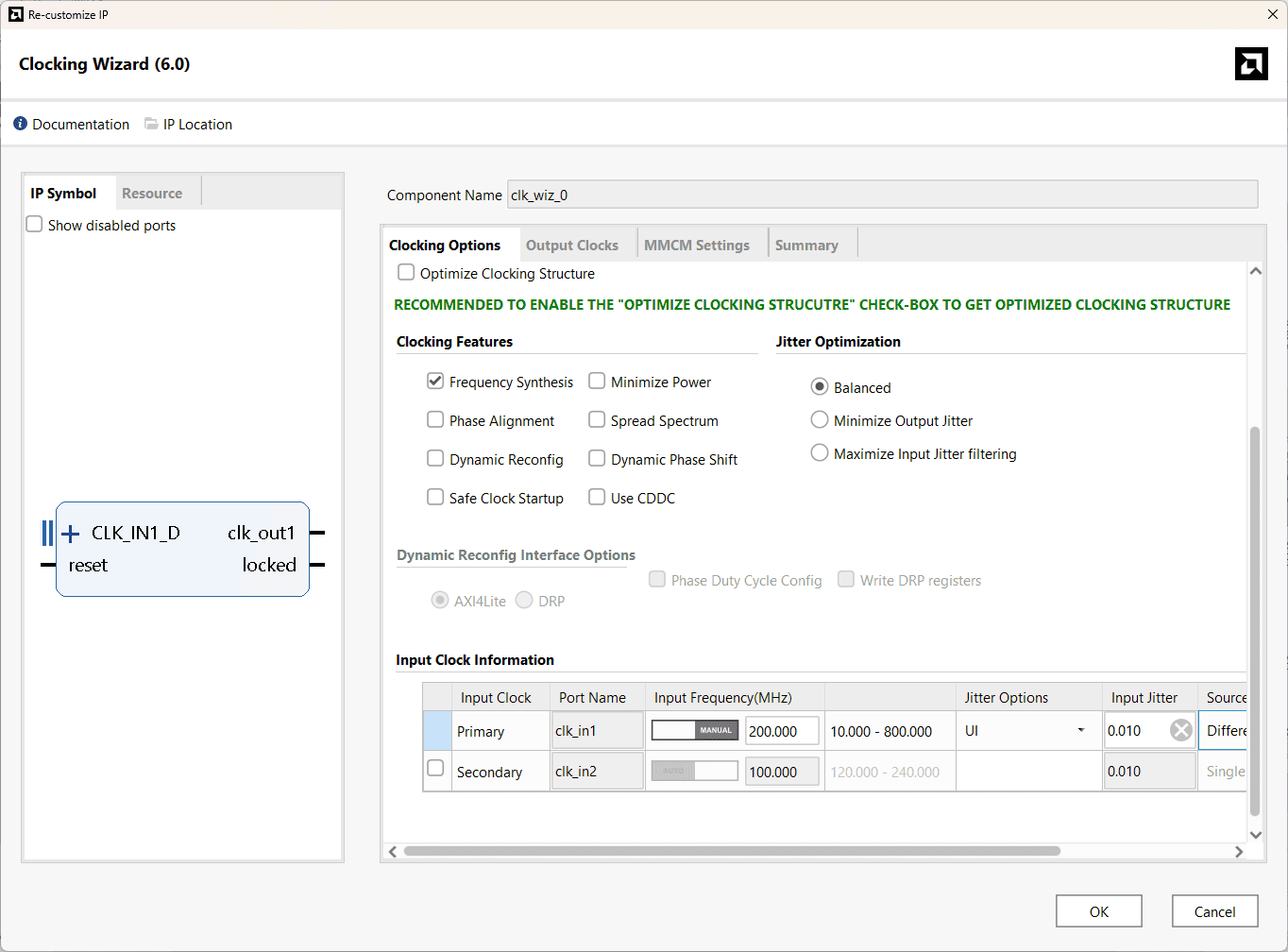 Customize the Clocking Wizard IP as shown in the images below: