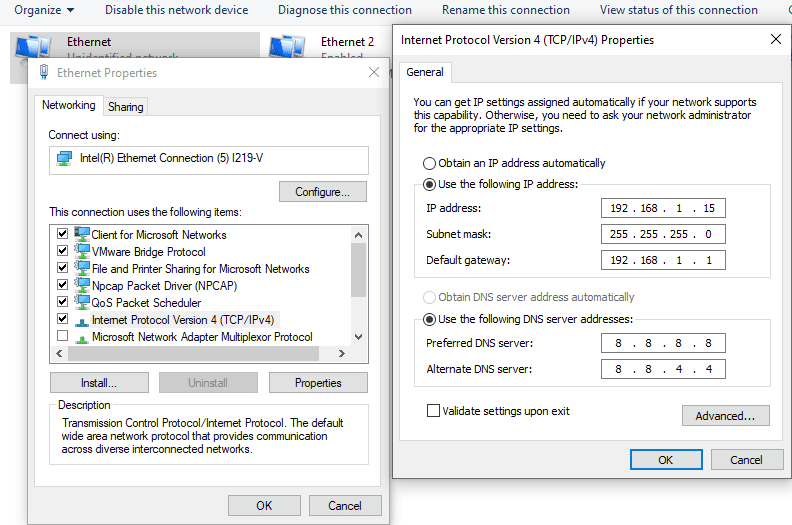 Connect the Ethernet cable to the board and the other end to the PC Ethernet port. Go to Control Panel. Go to Network and Internet -> Network and Sharing Centre -> Change adapter settings. Select “Change adapter settings”. Right-click on Ethernet, click properties, and select “IPv4”. Change the IPv4 address to 192.168.1.15 (any IP address can be used) and the default gateway to 192.168.1.1.
