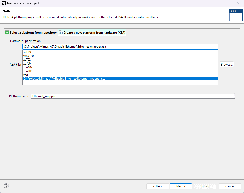 In the Platform, window select Create a new platform from the hardware Tab and import the XSA file which is already created (Provide XSA file location). Click Next.