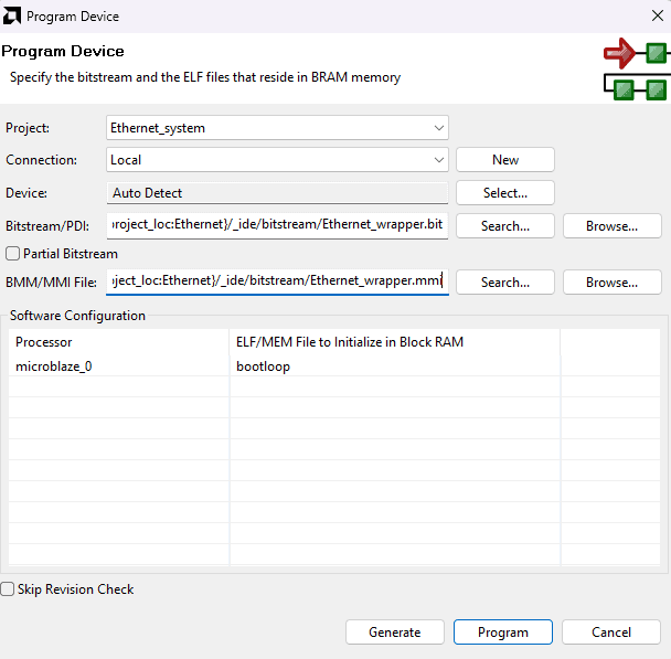 Click Generate Bitstream under the PROGRAM AND DEBUG section of Vivado to synthesize, implement and generate the bitstream.