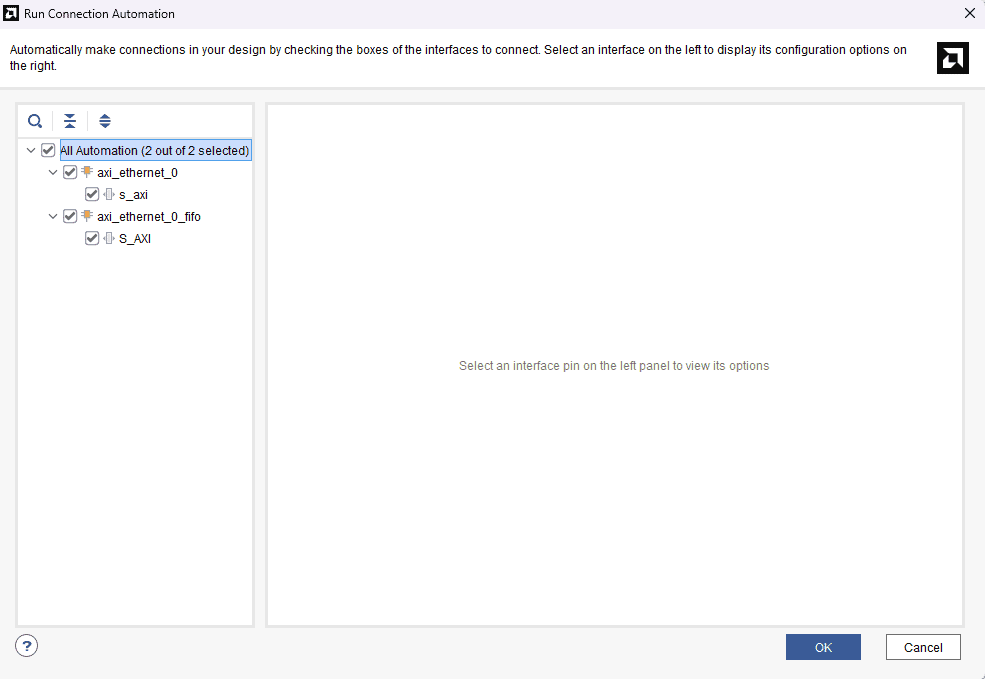 Run Block Automation for AXI Ethernet and select “DMA/FIFO” for the AXI Streaming interface.