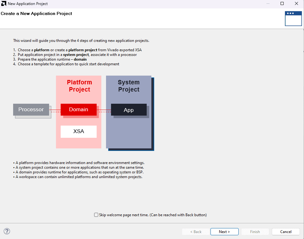 In the Application Project Details window, give an appropriate name for the Vitis Project and click Next. Click Next in the Domain window.