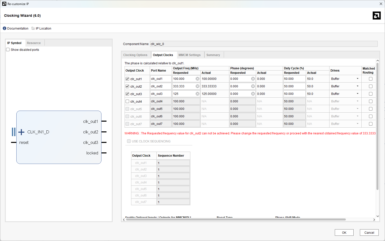 Double click on Clocking Wizard IP block and change the settings as shown below. In the Output Clocks section, set: