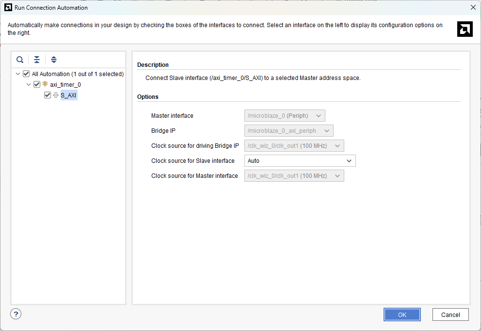 Add AXI Timer into IPI Canvas and click Run Connection Automation.