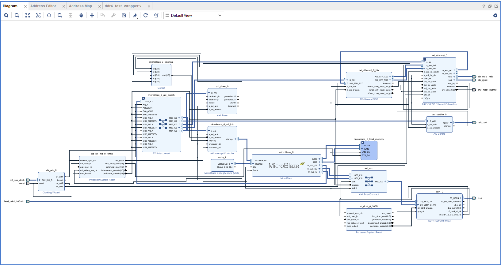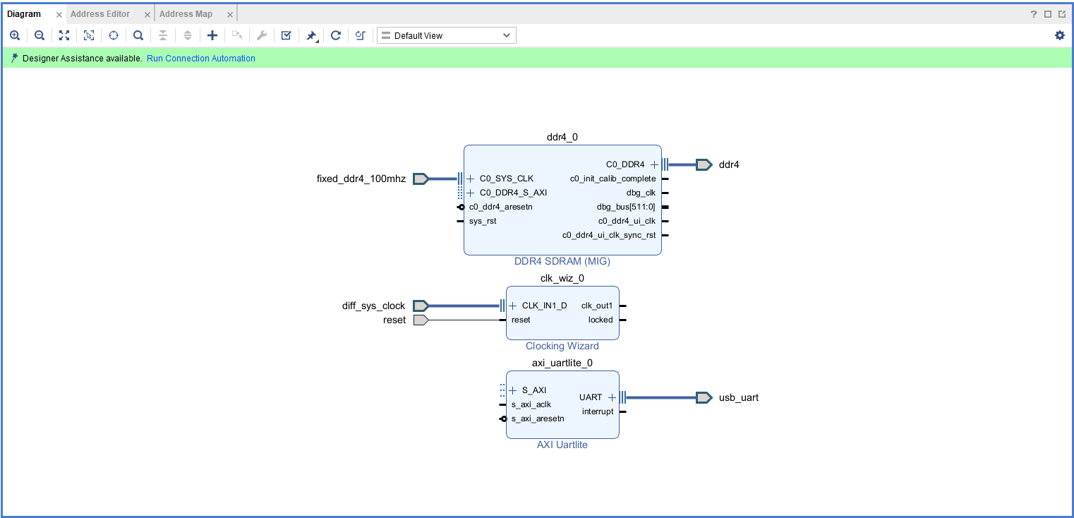 Click Run Connection Automation and select all to connect AXI interfaces of DDR4, Uartlite IPs, and their clocks and resets.