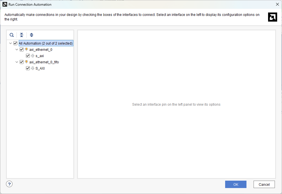 Run Block Automation for AXI Ethernet and select “FIFO” for the AXI Streaming interface.