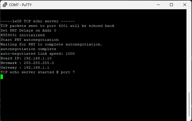 Open a telnet session with IP Address 192.168.1.10 (IP address as per main.c) at port 7, give input through the keyboard and observe the output. If you enter a character from the keyboard, you can observe the transmitted and echoed characters on telnet as shown.