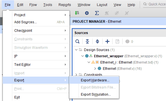 After generating the bitstream successfully, select Export -> Export Hardware from the File menu. Click Next.