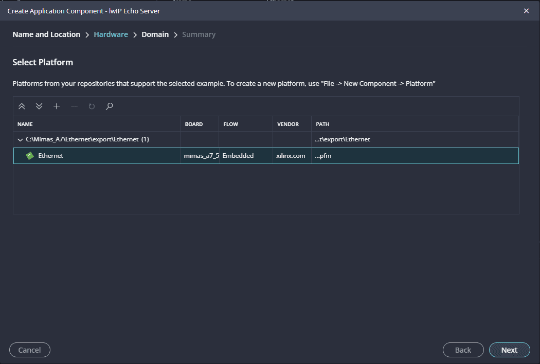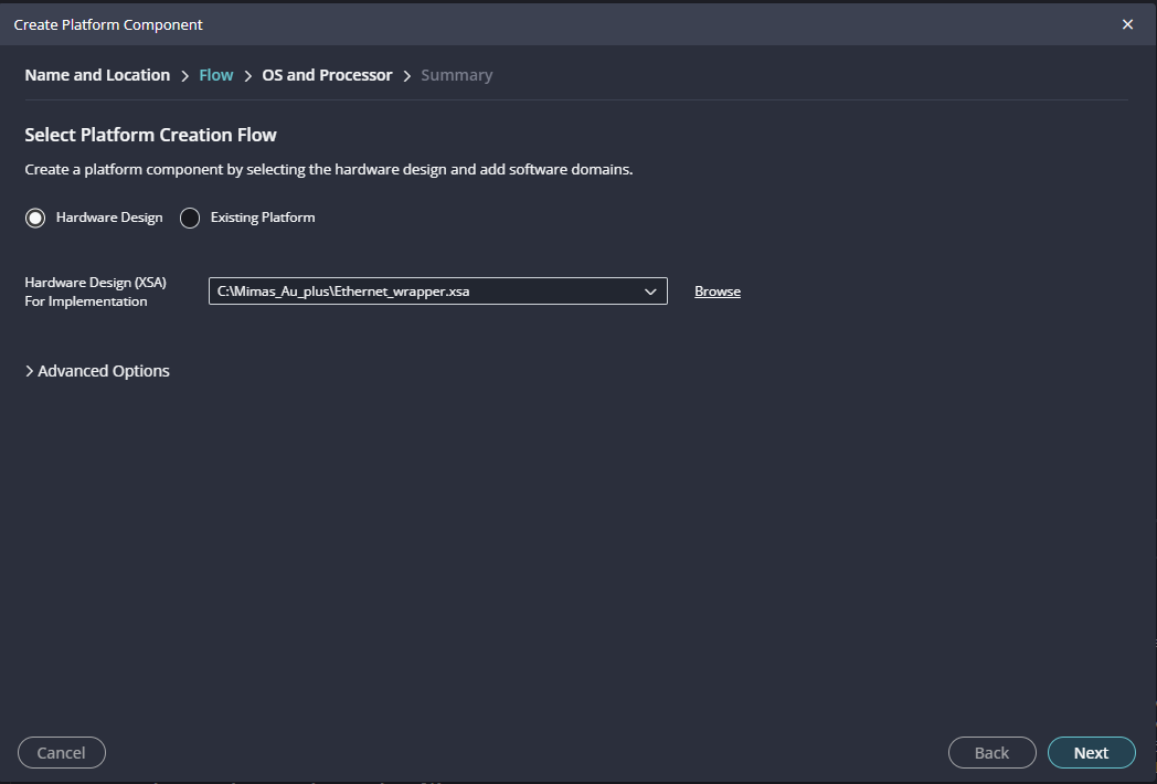 Launch Vitis IDE and create a new platform for the project, by selecting “Create Platform Component”, click “Next”, in the Flow tab select the XSA file saved and finally click “Next” and “Finish” respectively.