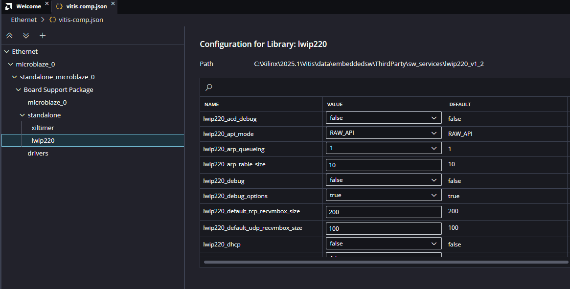 After building the platform go to Board Support Packages configuration of the newly created platform and add lwip220 library to the platform.