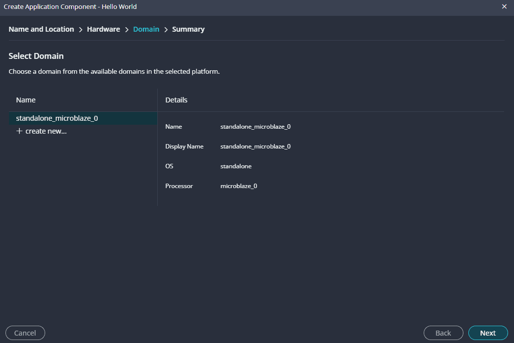 Select the domain as “Standalone_microblaze_0” and click “Next” and click on “Finish”.