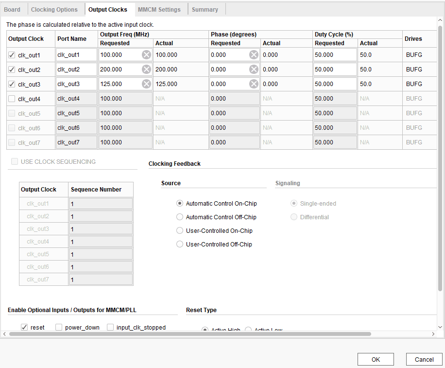 Double click on Clocking Wizard IP block and change the settings as shown below. In the “Output Clocks” section, set clk_out1 frequency to 100 MHz, clk_out2 to 200 MHz, and clk_out3 to 125 MHz. Click “OK” to customize the IP.