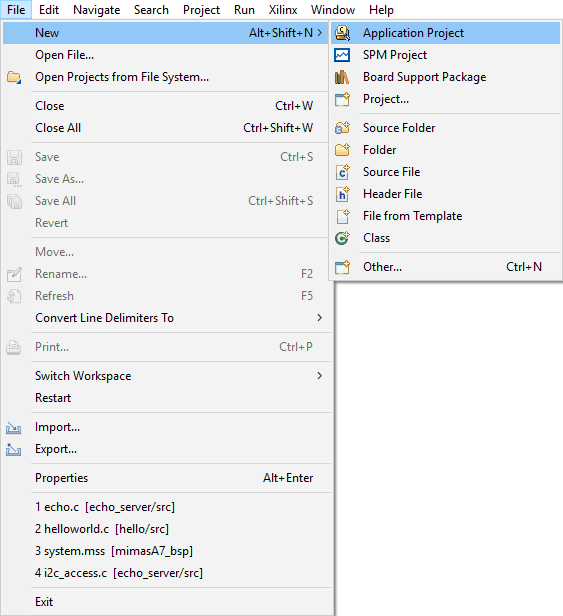 Select “Application Project” from the File menu. Type in a project name, select hardware platform and click “Next”.