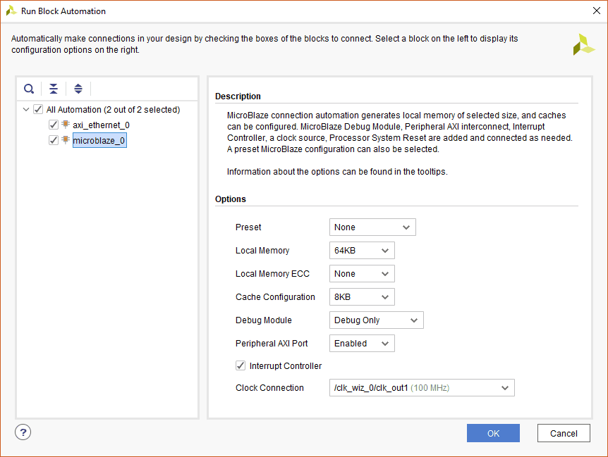 Click “Run Block Automation”. Change the settings as shown below. Select the “Interrupt Controller” checkbox. Click “OK” to proceed.