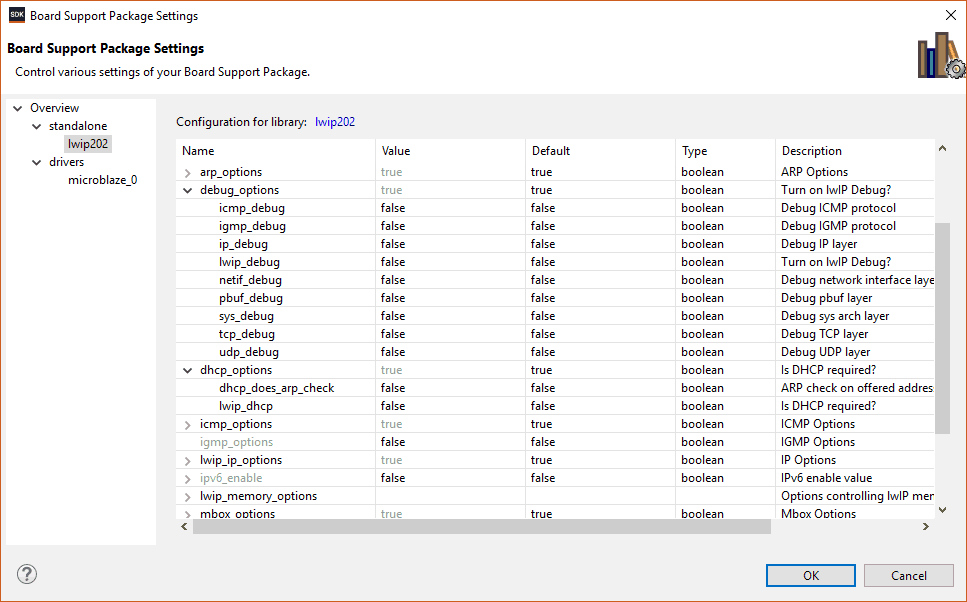Select “Board Support Package Settings” from the “Xilinx” menu. Select lwip library, change the “dhcp options” to “false” and ensure that “debug options” are “false”.
