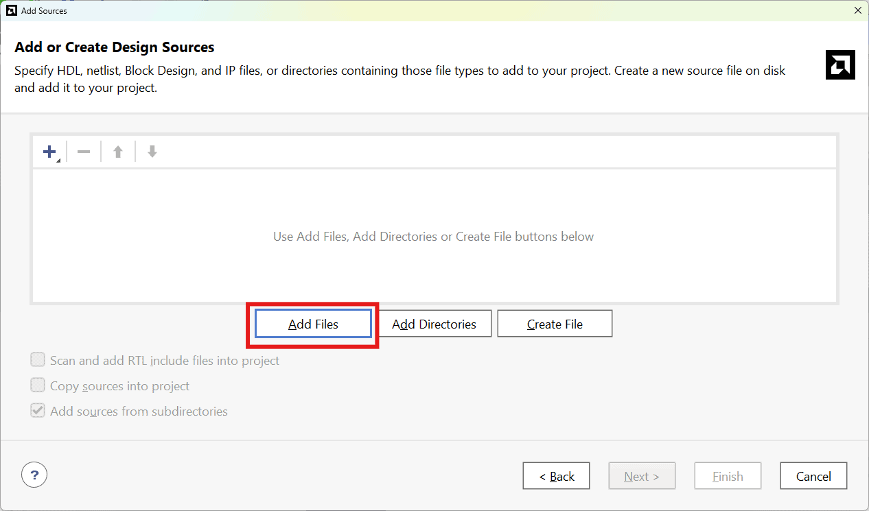 Download and extract the RTL source files from here and add them to the project by selecting ‘Add Files’ in the “Add or Create Design Sources” tab and click on “Finish“.