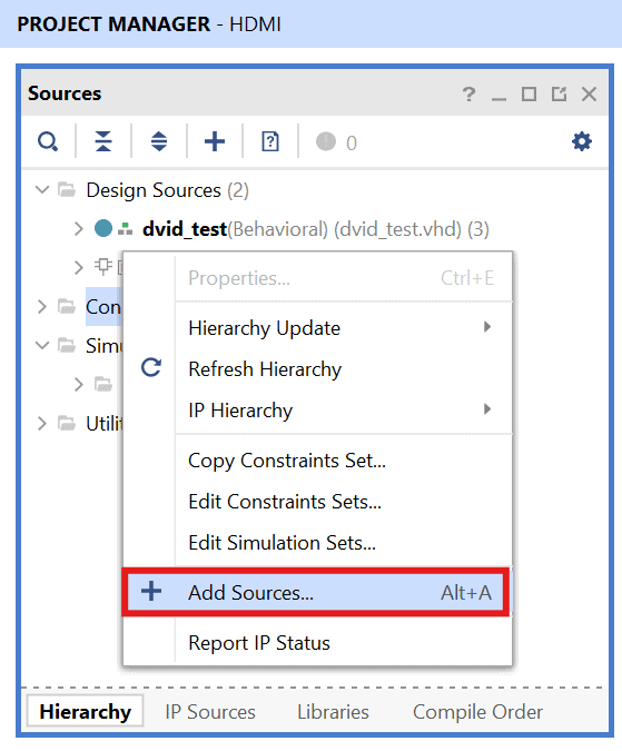 Then in the Sources tab, Right-click ‘Design Sources’ and click ‘Add Sources’. It will open a new ‘Add Sources’ window.
