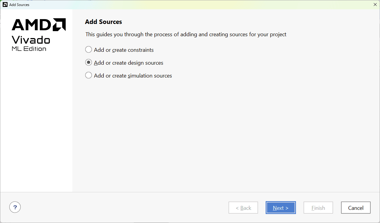 Once the “Add Sources” window opens select “Add or create design sources” and click on “Next“