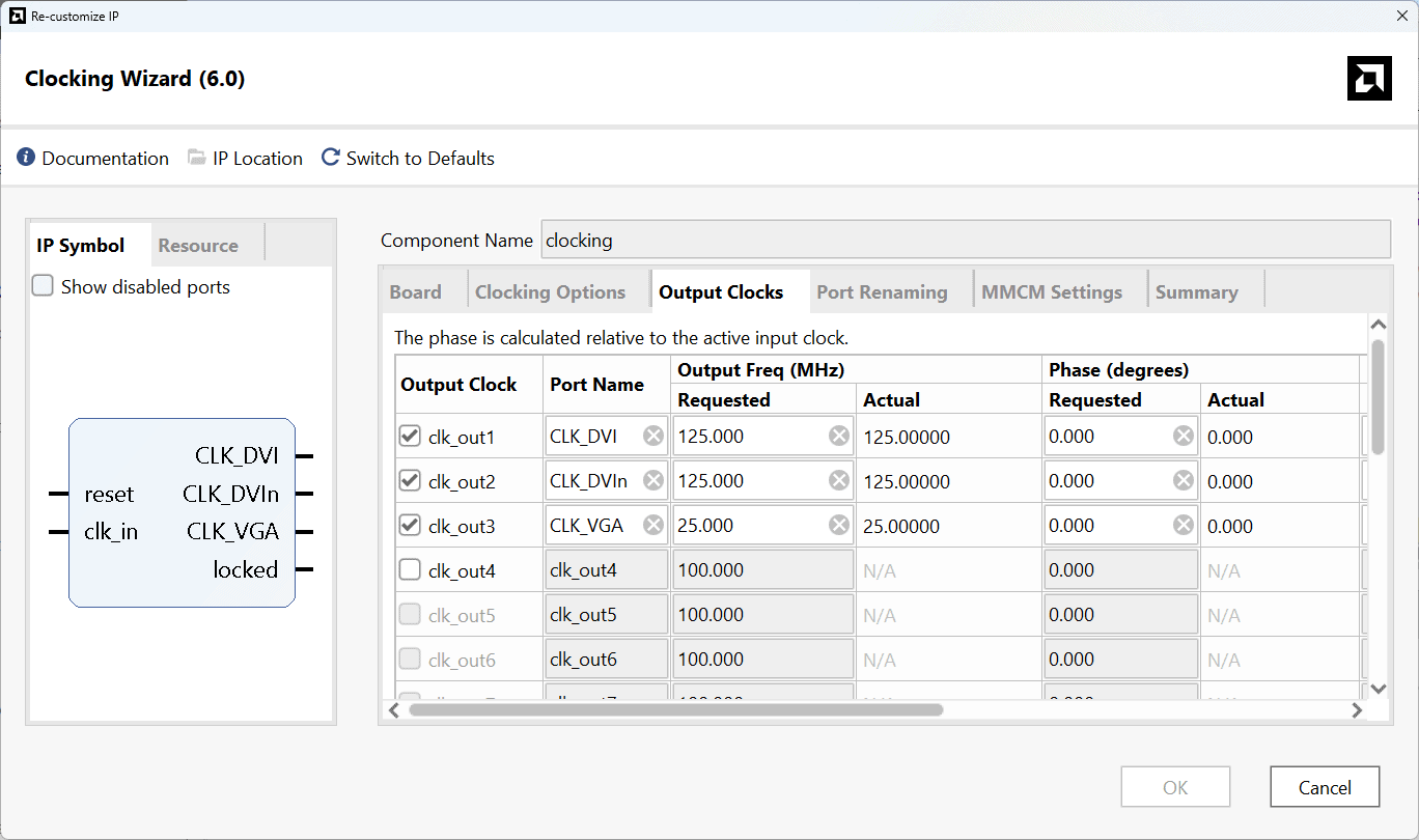 clk_vga: 25MHz clock. This is the pixel clock frequency for 640×480@60Hz VGA resolution.clk_dvi&clk_dvin: 125 MHz clocks.clk_dvinis 180 degrees out of phase toclk_dvi. These clocks are used for serialization using ODDR2.