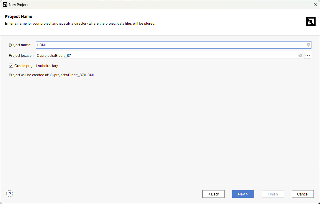Type in a project name and save it at a convenient location. For this example “HDMI” is used as project name, but feel free to use any name. Select the check box below to keep all project files in a single folder. The image below shows the settings for the example project. Click “Next” to continue.
