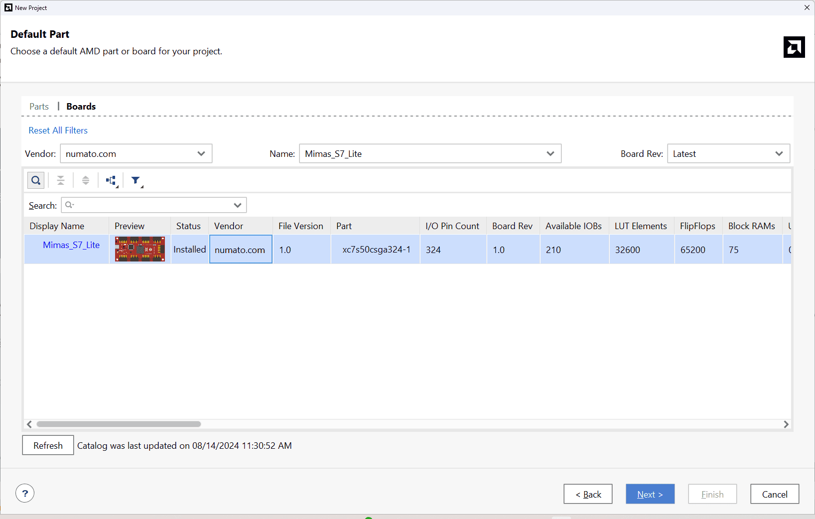 At the “Default Part” step, select “Boards” and choose Vendor as “numato.com”. Select “Mimas_S7_Lite” and click “Next”. If Mimas_S7_Lite is not displayed in the boards list, you will need to install Mimas_S7_Lite board support files correctly.