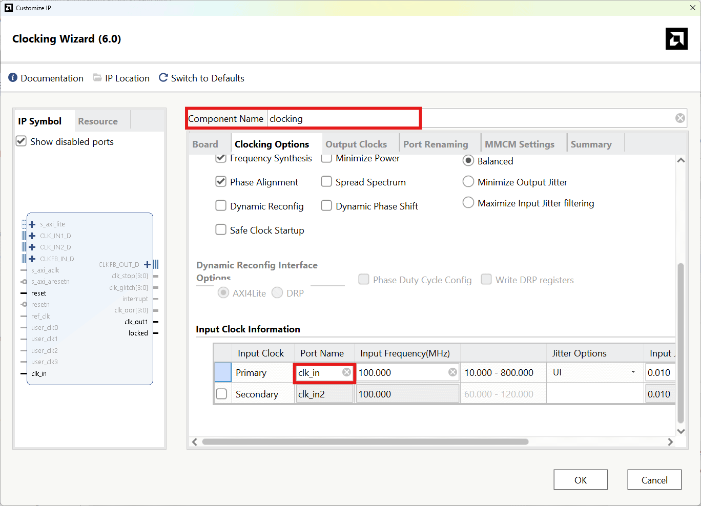 In ‘Clocking Options’ tab, give Component Name as ‘clocking’ and primary clock port name as ‘clk_in’.