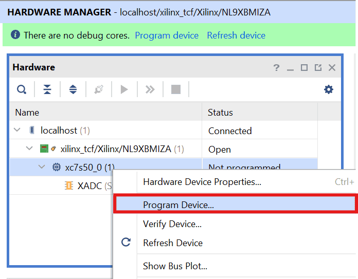 Right Click on the device (xc7s50_0) and select “Program Device” option.