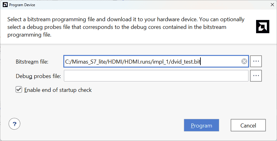 Once Mimas S7 Lite is successfully programmed, it should begin generating HDMI signals and the monitor should display a colorful pattern at 640×480 @ 60Hz resolution.
